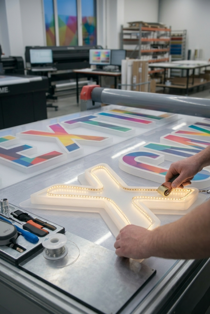 Große Ideen verdienen großen Ausdruck – mit unserem leistungsstarken Druck- und Produktionsservice. Vom digitalen Großformatdruck für beeindruckende Werbeflächen über präzise CNC-Fräsarbeiten bis hin zu flexiblen Textilspannrahmen: Wir bringen Ihre Visionen in die Realität. Unsere hochmodernen Drucktechniken und Produktionsverfahren garantieren Ihnen brillante Farben, gestochen scharfe Details und eine außergewöhnliche Langlebigkeit. Bei uns verschmelzen Kreativität und Technik zu erstklassigen Ergebnissen.